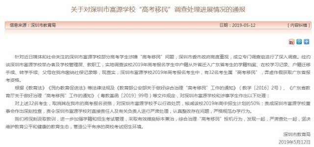 5月12日晚,深圳市教育局發(fā)布《關于對深圳市富源學?!案呖家泼瘛闭{(diào)查處理進展情況的通報》,通報稱,經(jīng)查實,深圳市富源學校2019年高考報名考生中,有32名考生屬“高考移民”,弄虛作假獲取廣東省報考資格。按照相關法例,對涉事32名學生取消在深圳市的高考報名資格,對深圳市富源學校予以行政處罰,核減該校2019年高中招生計劃的50%;責成深圳市富源學校董事會作出深刻檢查,責令深圳市富源學校對直接責任人及有關負責人進行嚴肅處理,認真整改存在問題,嚴格規(guī)范辦學行為。