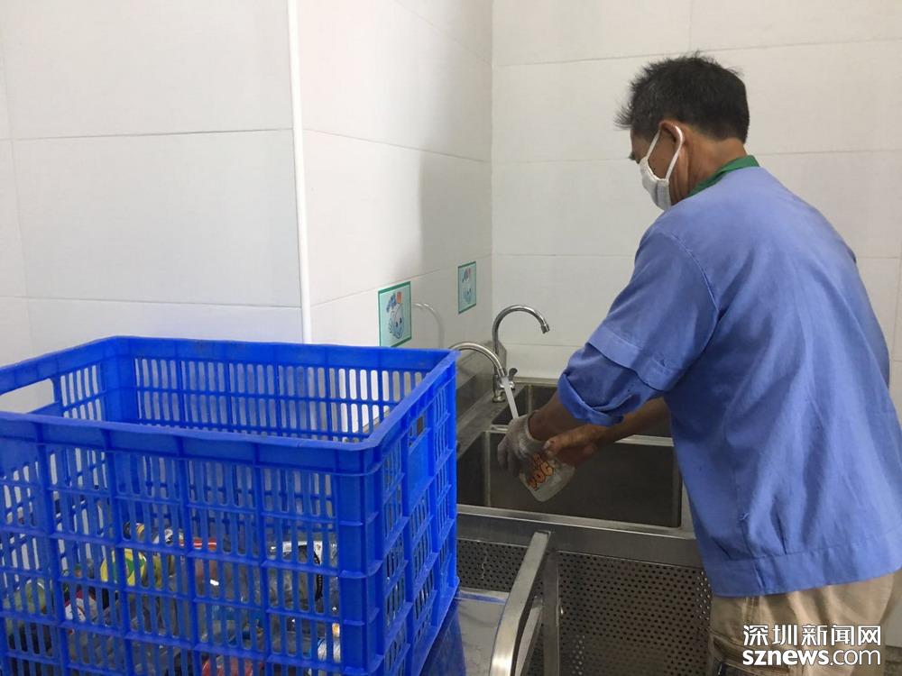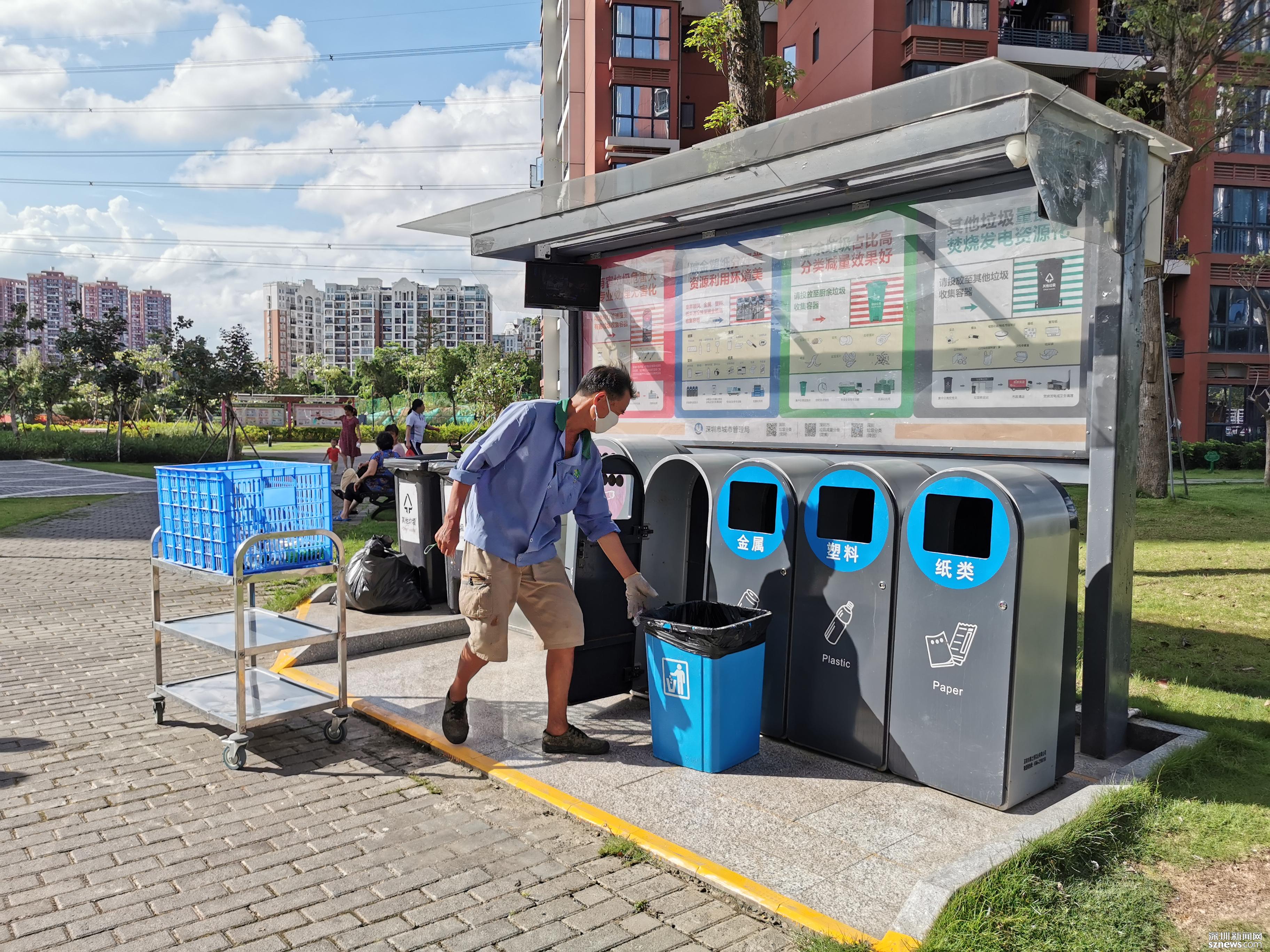 鄧伯今年60歲,是來深圳帶孫子的,因?yàn)槔习槟軒兔?,所以他?yīng)聘成為了一名小區(qū)清潔員。小區(qū)實(shí)行垃圾分類一年多以來,鄧伯工作輕松了很多。每天他只需巡視幾遍垃圾桶,將滿了的垃圾裝在框里帶回暫存點(diǎn),進(jìn)行二次分揀和清洗后,再將垃圾桶歸放原處;等物業(yè)在微信平臺上聯(lián)系好運(yùn)送車輛,協(xié)助運(yùn)送人員運(yùn)走垃圾就行。