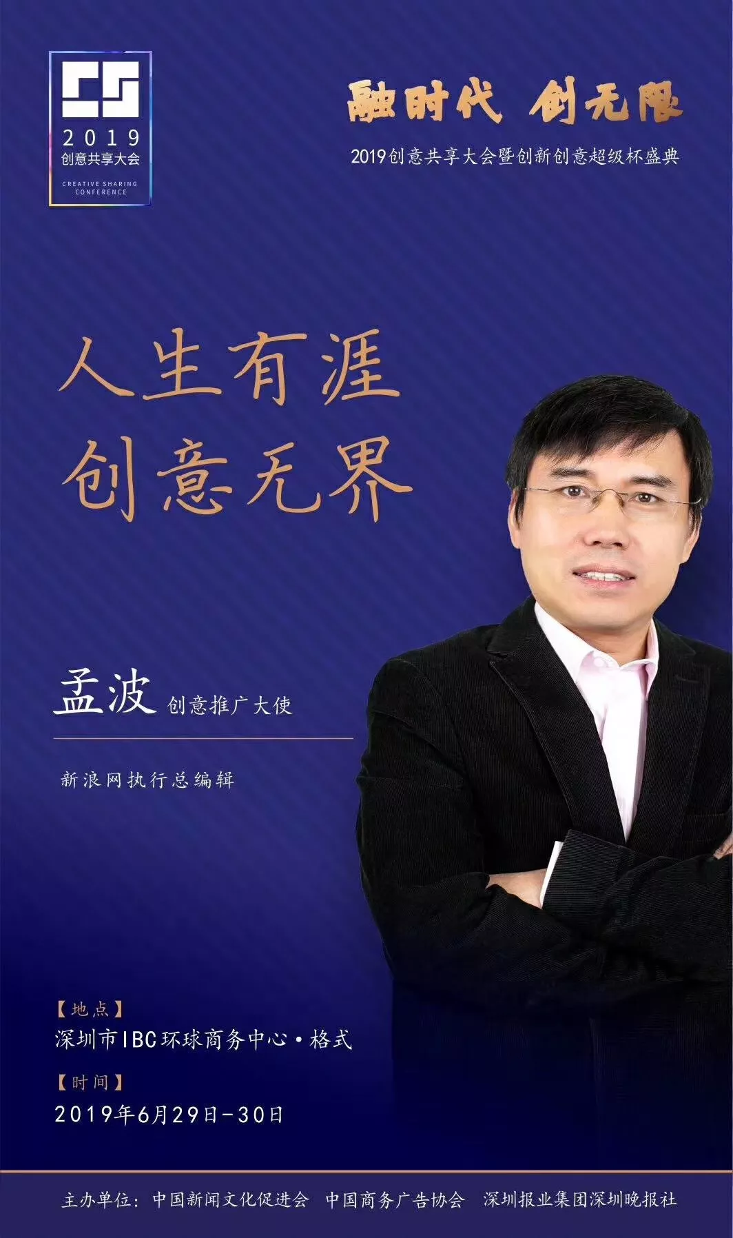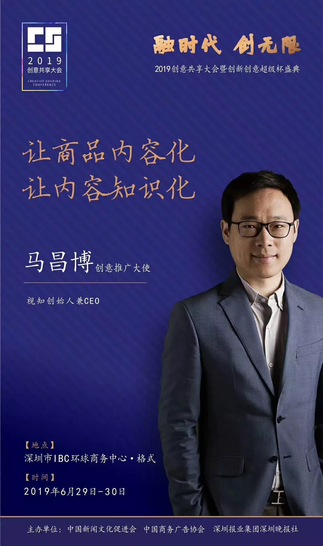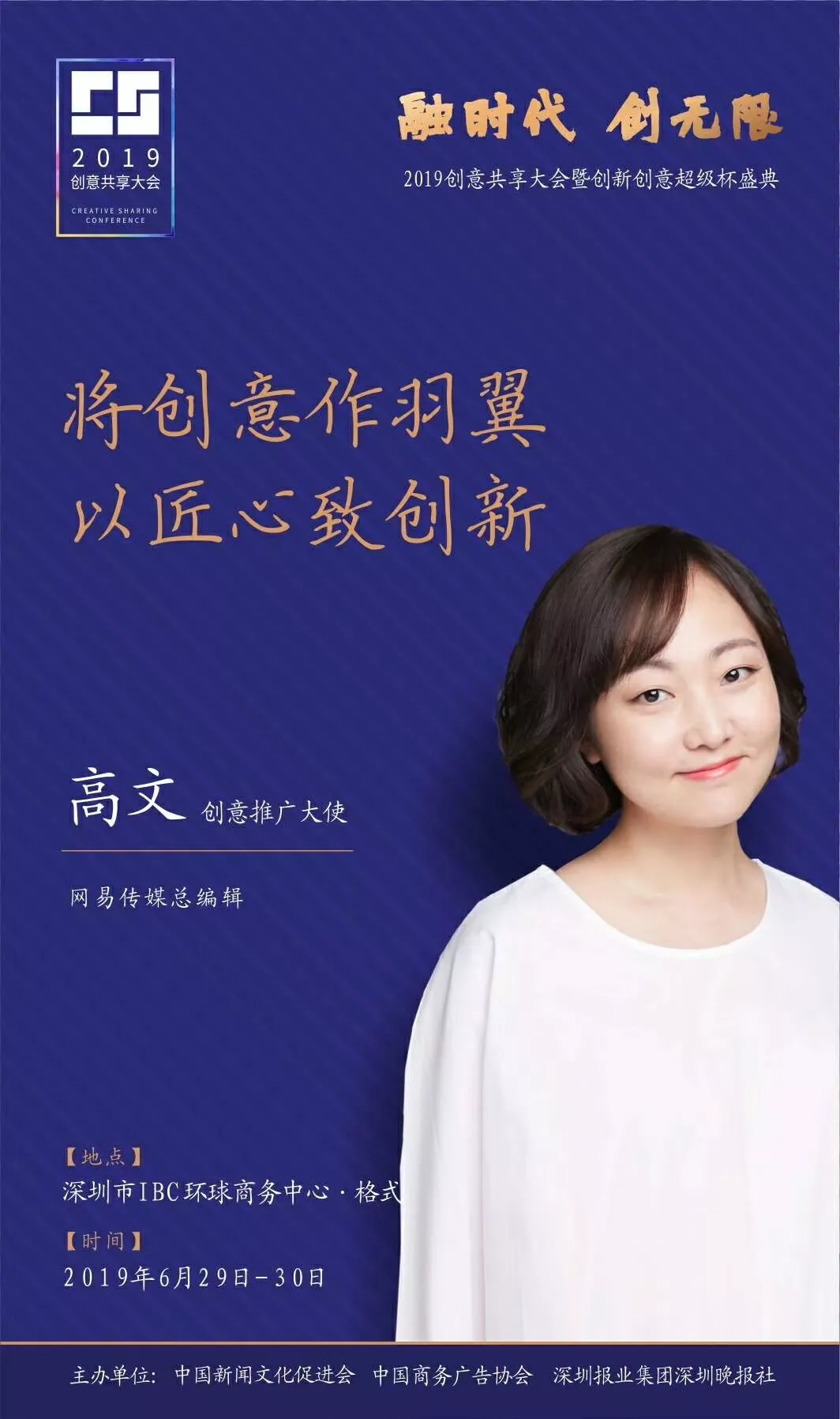 為了展現(xiàn)創(chuàng)意中國(guó)的精神風(fēng)貌和創(chuàng)意傳媒的文化力量,構(gòu)建創(chuàng)新創(chuàng)意共同體,擘畫(huà)美好圖景和未來(lái)趨勢(shì),2019年6月29日至30日,由中國(guó)新聞文化促進(jìn)會(huì)、中國(guó)商務(wù)廣告協(xié)會(huì)、深圳報(bào)業(yè)集團(tuán)深圳晚報(bào)社等聯(lián)合主辦的“融時(shí)代創(chuàng)無(wú)限——2019創(chuàng)意共享大會(huì)暨創(chuàng)新創(chuàng)意超級(jí)杯盛典”將在深圳市IBC環(huán)球商務(wù)中心隆重舉辦。