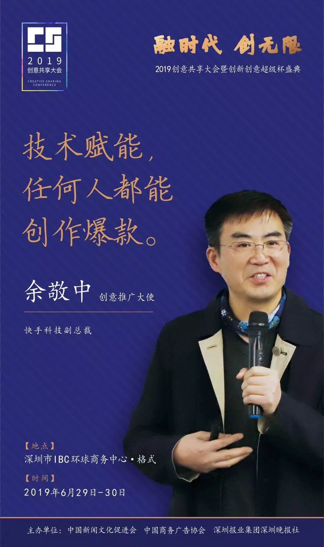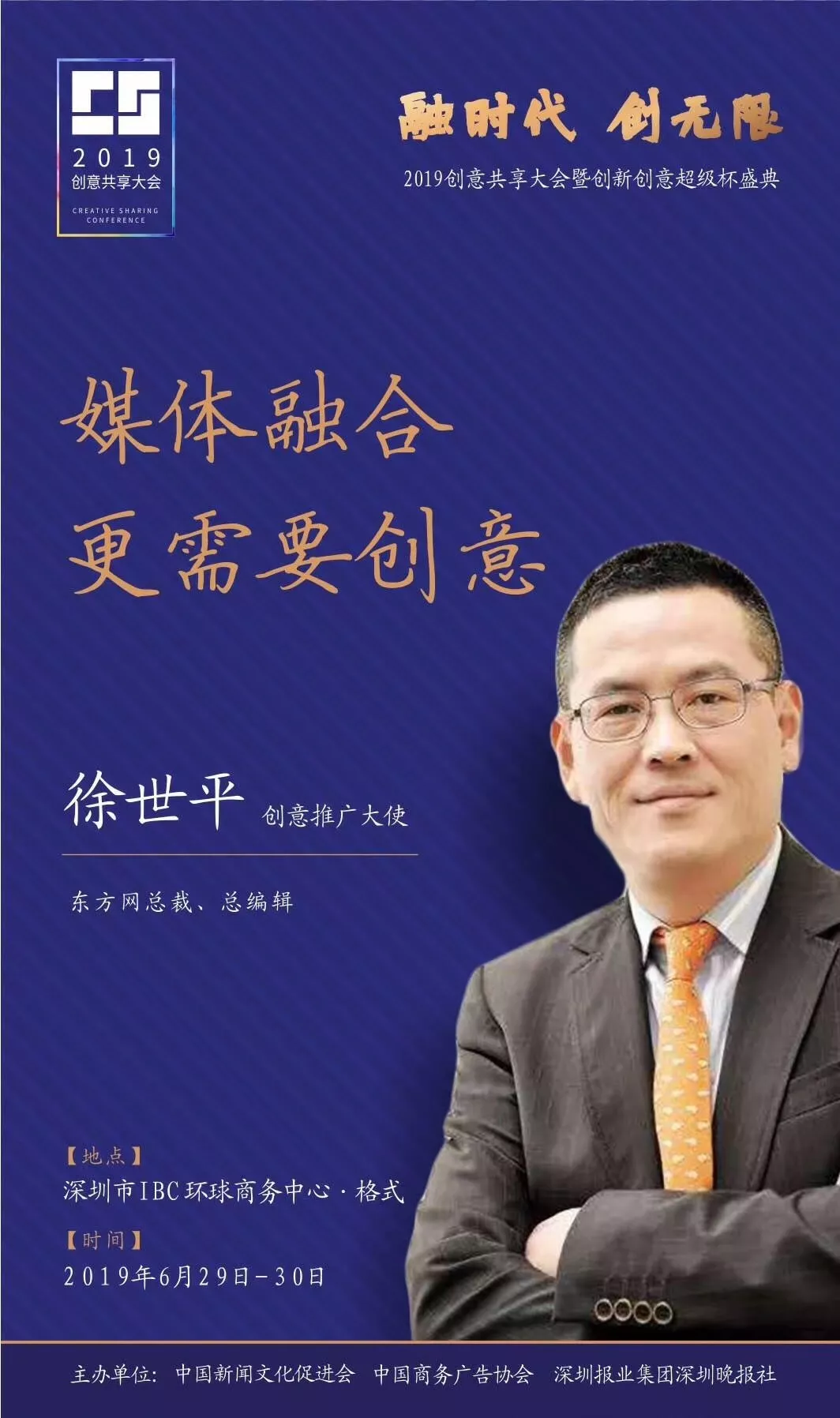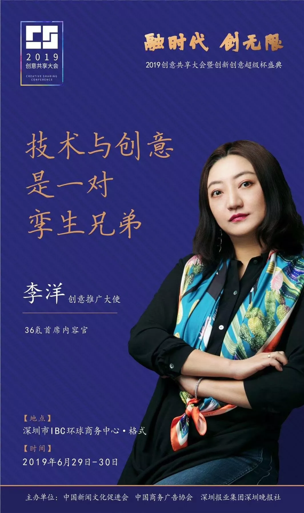 為了展現(xiàn)創(chuàng)意中國(guó)的精神風(fēng)貌和創(chuàng)意傳媒的文化力量,構(gòu)建創(chuàng)新創(chuàng)意共同體,擘畫(huà)美好圖景和未來(lái)趨勢(shì),2019年6月29日至30日,由中國(guó)新聞文化促進(jìn)會(huì)、中國(guó)商務(wù)廣告協(xié)會(huì)、深圳報(bào)業(yè)集團(tuán)深圳晚報(bào)社等聯(lián)合主辦的“融時(shí)代創(chuàng)無(wú)限——2019創(chuàng)意共享大會(huì)暨創(chuàng)新創(chuàng)意超級(jí)杯盛典”將在深圳市IBC環(huán)球商務(wù)中心隆重舉辦。