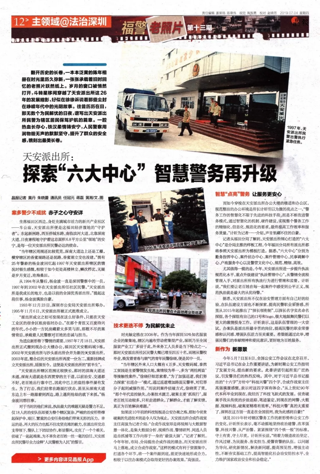 新作為新愿景今年5月7日至8日,全國公安工作會議在北京召開,習近平總書記在會上作重要講話,為新時期公安工作指明了發(fā)展方向,提出新的要求。此番講話引起所里廣泛熱議,引發(fā)警員們的熱烈反響。其中,對于習近平總書記提出的“十六字”方針中“科技興警”四個字,合成作戰(zhàn)室主任高強滿腹感慨,表示對這四字深有體會?!皬纳鲜兰o90年代本科畢業(yè)到現(xiàn)在,我經(jīng)歷了科技飛躍式的發(fā)展。偵查破案手段從傳統(tǒng)的步法追蹤、筆跡鑒定,到現(xiàn)在的網(wǎng)警、大數(shù)據(jù)、視頻科技,破案更精準有效率,‘科技興警’真的太重要了,深圳在這方面一直走在全國前列,我為此感到自豪!”
