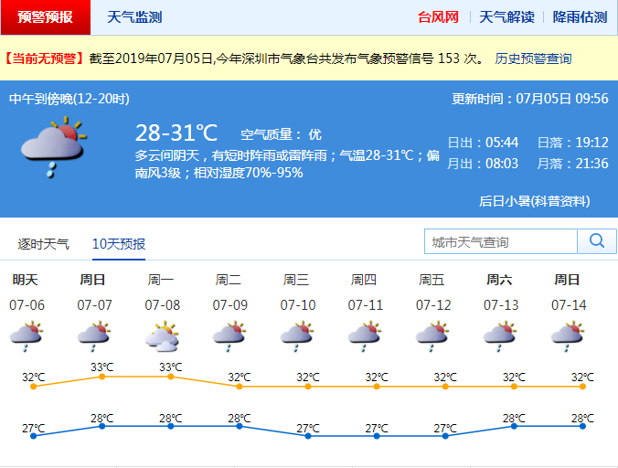 深圳新聞網(wǎng)2019年7月5日訊 第4號(hào)臺(tái)風(fēng)“木恩”(熱帶風(fēng)暴級(jí))已經(jīng)于4日早上登陸越南北部沿海,對(duì)深圳影響減弱。據(jù)深圳市氣象局消息,今日深圳多云間陰天,有短時(shí)陣雨或雷陣雨;氣溫28-31℃;