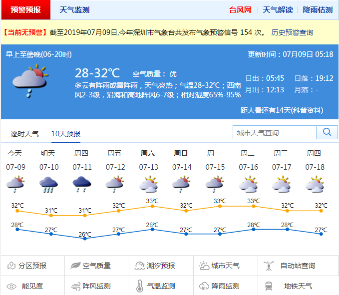 近幾天,深圳天氣炎熱,有短時(shí)陣雨,白天最高氣溫達(dá)到31~33 ℃。預(yù)計(jì)9日有陣雨或雷陣雨,10~11日將有一次中到大雨局部暴雨過(guò)程,伴有雷暴和7~8級(jí)短時(shí)大風(fēng),炎熱天氣將有所緩解。