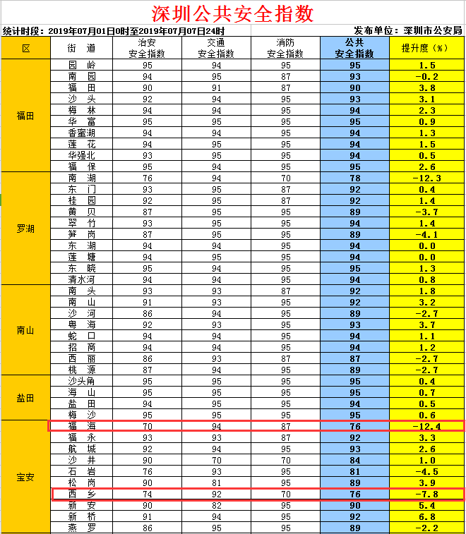 深圳新聞網(wǎng)2019年7月9日訊 深圳市公安局圍繞市委市政府“城市管理治理年”工作部署要求,借鑒國內(nèi)其他城市的成功做法,于2016年4月5日開始,每周通過《深圳特區(qū)報》、《深圳新聞網(wǎng)》、市公安局門戶網(wǎng)站、公安微信、微博,向社會發(fā)布一次深圳公共安全指數(shù),保障市民群眾知情權(quán)、監(jiān)督權(quán),引導(dǎo)社會各界廣泛參與“平安深圳”建設(shè)。