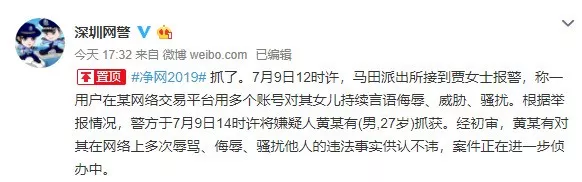深圳公安發(fā)出警情通報,7月9日下午兩點左右,將犯罪嫌疑人黃某有抓獲。經(jīng)初審,黃某有對其在網(wǎng)絡上多次辱罵、侮辱、騷擾他人的違法事實供認不諱。目前,案件正在進一步偵辦當中。