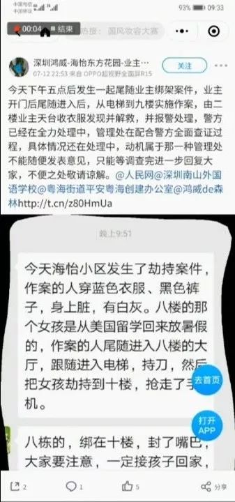 這兩天微博上流傳南山海怡東方小區(qū)發(fā)生了一起“尾隨業(yè)主綁架”案件,該小區(qū)業(yè)主論壇都炸開鍋了,聊天記錄透露的細節(jié)讓人震驚——“電梯內(nèi)女孩被持刀劫持”、“搶走手機”、“嫌疑人是電器維修人員”,到底這事是真是假?