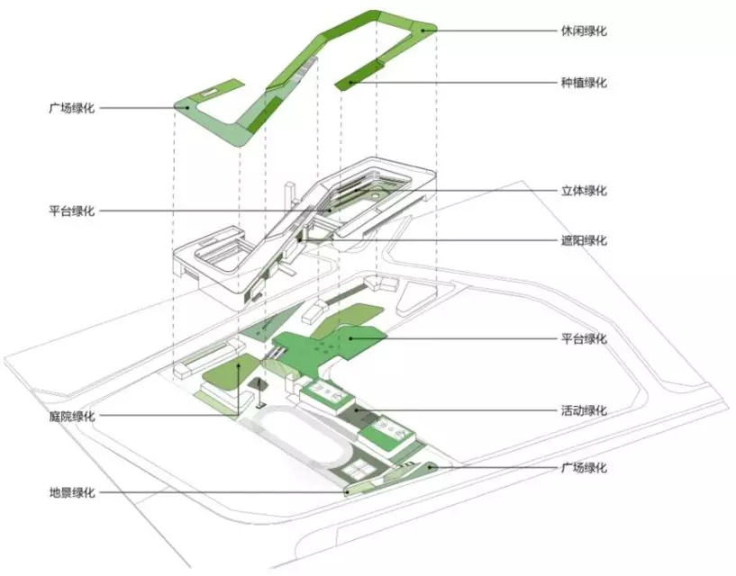 龍華區(qū)行知學校用地被西側的城市綠地、東南角的獅徑公園所包裹,具備天然的景觀優(yōu)勢。在內部布局中,將場地、屋頂、架空層、立面結合起來,賦予多層次的綠化空間,打造真正的綠色校園。