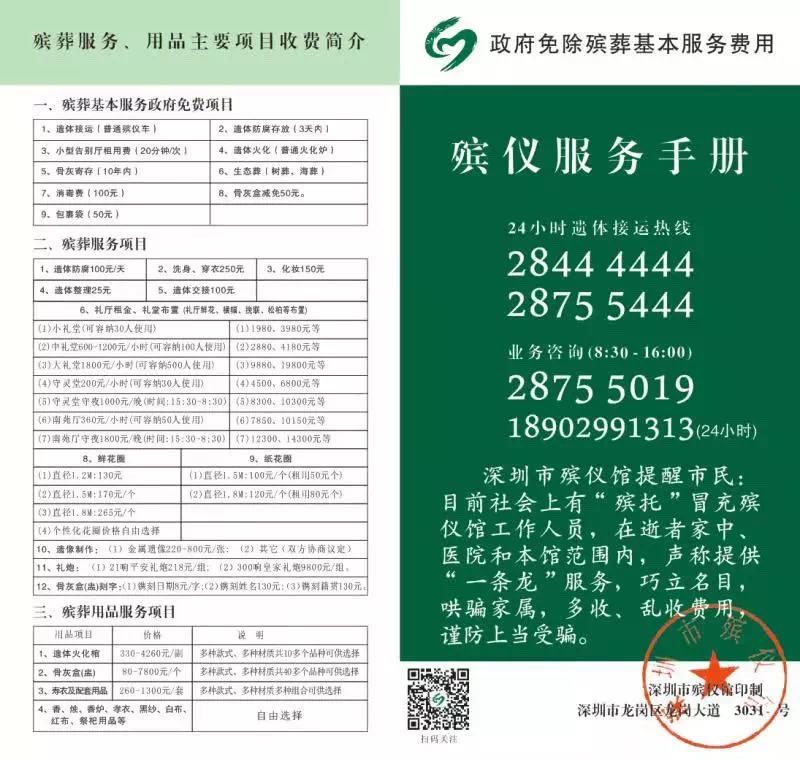 “深圳只有一家合法的殯儀館,就是深圳市殯儀館,其殯儀收費標準可以通過‘深圳民政在線’的‘殯儀服務(wù)’查詢。”市殯管所相關(guān)負責(zé)人表示,市民也可以關(guān)注“深圳市殯儀館”的微信公眾號查詢治喪流程、聯(lián)系電話和收費標準。