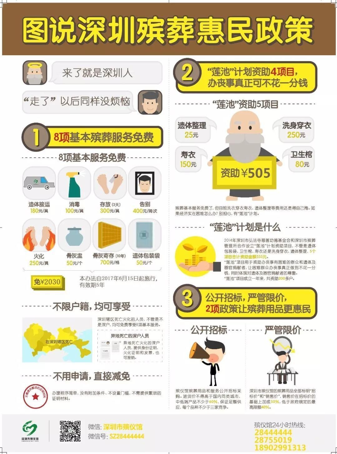 深圳的惠民殯葬服務(wù)有哪些?據(jù)了解,自2012年6月15日起,我市開始實(shí)施《深圳市免除殯葬基本服務(wù)費(fèi)用實(shí)施辦法》,在全省率先為全體居民實(shí)施基本殯葬服務(wù)免費(fèi),免費(fèi)項(xiàng)目涵蓋9項(xiàng),包括遺體接運(yùn)費(fèi)(普通殯葬專用車)、遺體存放費(fèi)(3天以內(nèi))、遺體告別廳租用費(fèi)(小型告別廳)、遺體火化費(fèi)(普通火化爐)、骨灰寄存費(fèi)(10年以內(nèi))或生態(tài)葬(海葬、樹葬)、遺體消毒100元、骨灰盒(盅)(50元)、遺體包裹袋,免費(fèi)總額為2030元。截至今年4月,深圳已累計(jì)投入1.6億多元用于殯葬基本服務(wù)。