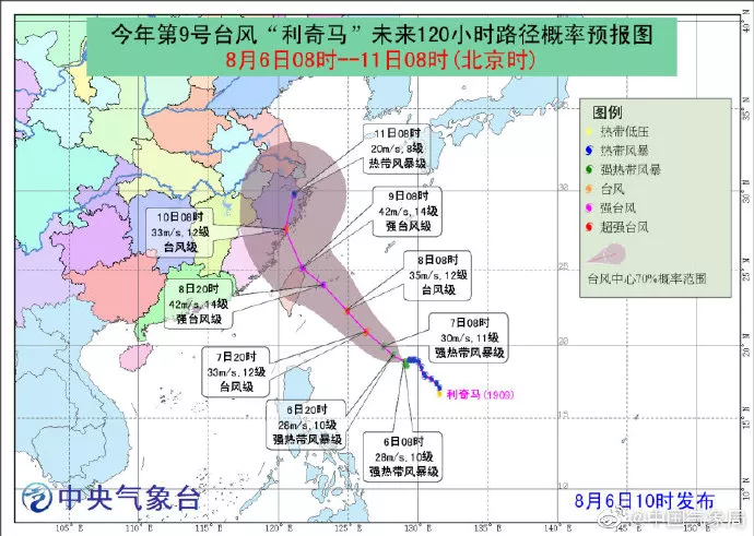 預計,“利奇馬”將以每小時5公里左右的速度緩慢向西北方向移動,強度逐漸增強,最強可達臺風級或強臺風級(12-14級,35-45米/秒),逐漸向我國東南沿??拷?。未來兩天對我國近海海域無影響。