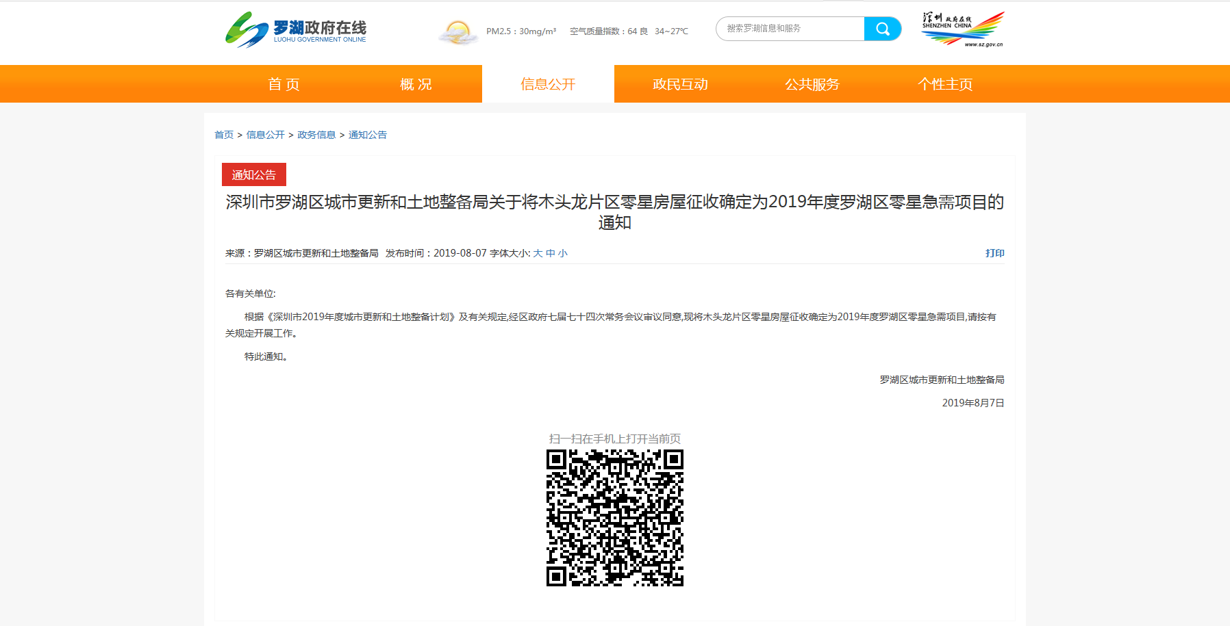“經過全面分析,木頭龍項目涉及眾多公共利益、現(xiàn)狀存在重大社會風險的情況下,根據(jù)《深圳市2019年度城市更新和土地整備計劃》房屋征收專項計劃中明確的‘考慮到各區(qū)公共利益項目的急需,各區(qū)區(qū)級房屋征收計劃可安排零星急需項目1項’,羅湖區(qū)政府將木頭龍片區(qū)零星房屋征收確定為2019年度羅湖區(qū)零星急需項目,并啟動征收程序,盡快破解重大歷史遺留難題,防范和化解重大風險,落實項目配套的交通設施、保障性住房等急需公共利益?!彼f,政府將依法依規(guī)實施房屋征收并進行征收補償,保障被征收人的合法權益。