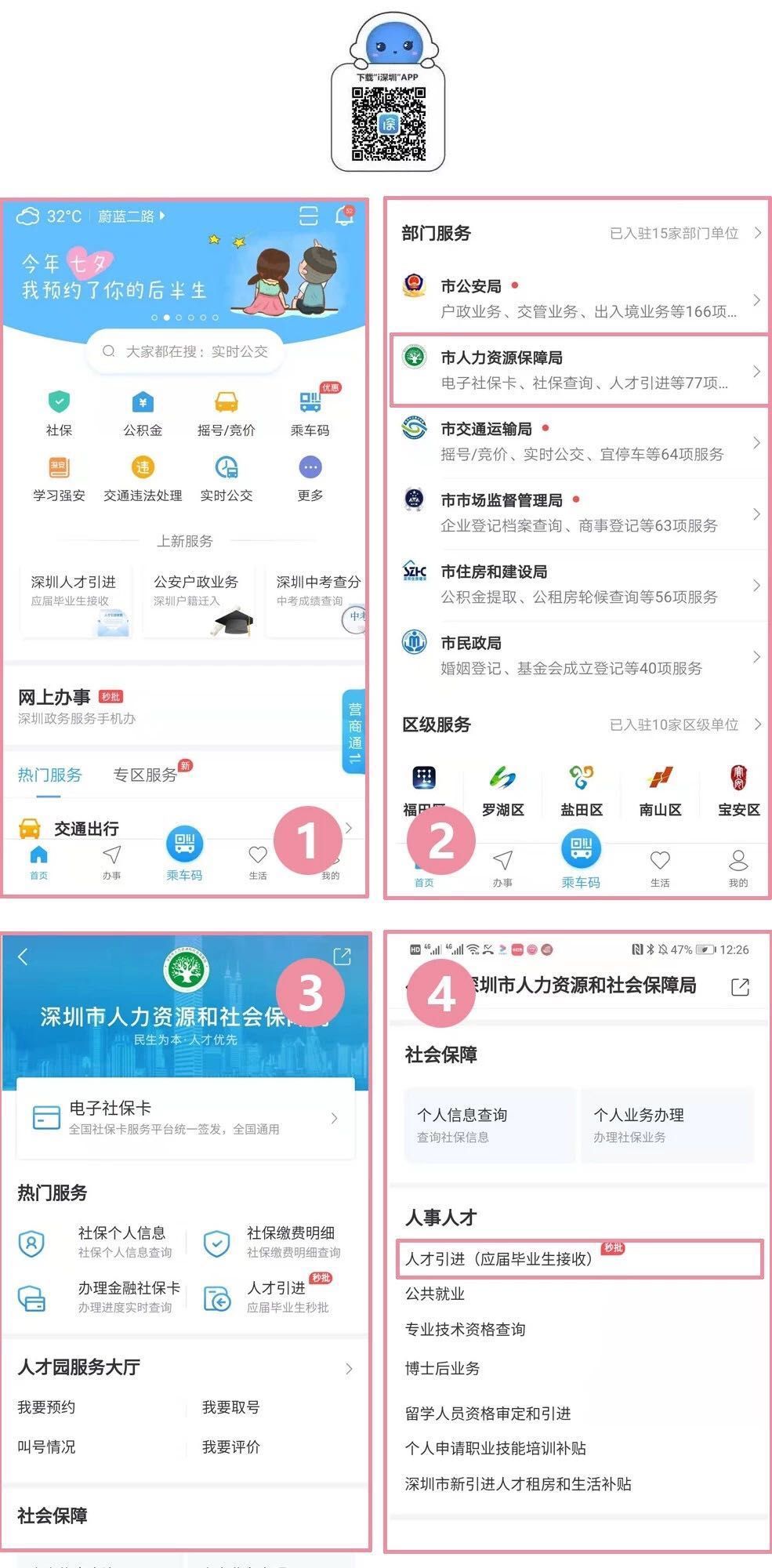 應(yīng)屆畢業(yè)生辦理人才引進(jìn)時,可以選擇下載“i深圳”APP在手機(jī)上辦理,路徑為:“i深圳”首頁-市人力資源保障局-人事人才:人才引進(jìn)(應(yīng)屆畢業(yè)生接收)。