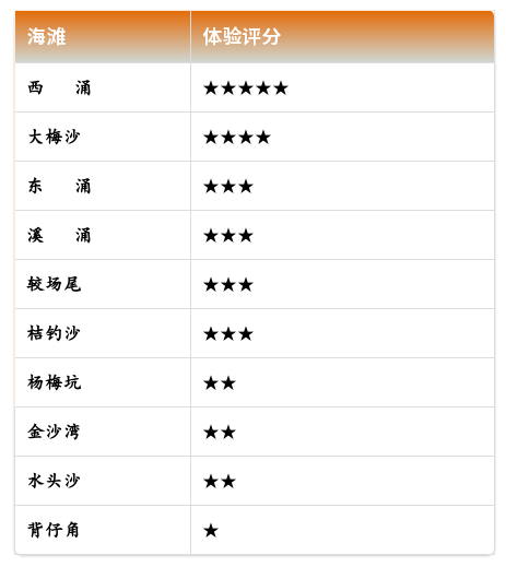 連日來,記者兵分多路,以自西向東、距離市區(qū)“由近及遠(yuǎn)”的方向沿海暴走,對其中10個知曉率最高的海灘進(jìn)行體驗式走訪,以“開放情況、是否收費、能否停車、便民服務(wù)、沙灘清潔、海域安全”六個方面為指標(biāo),以五星為滿分進(jìn)行了好感度評分。