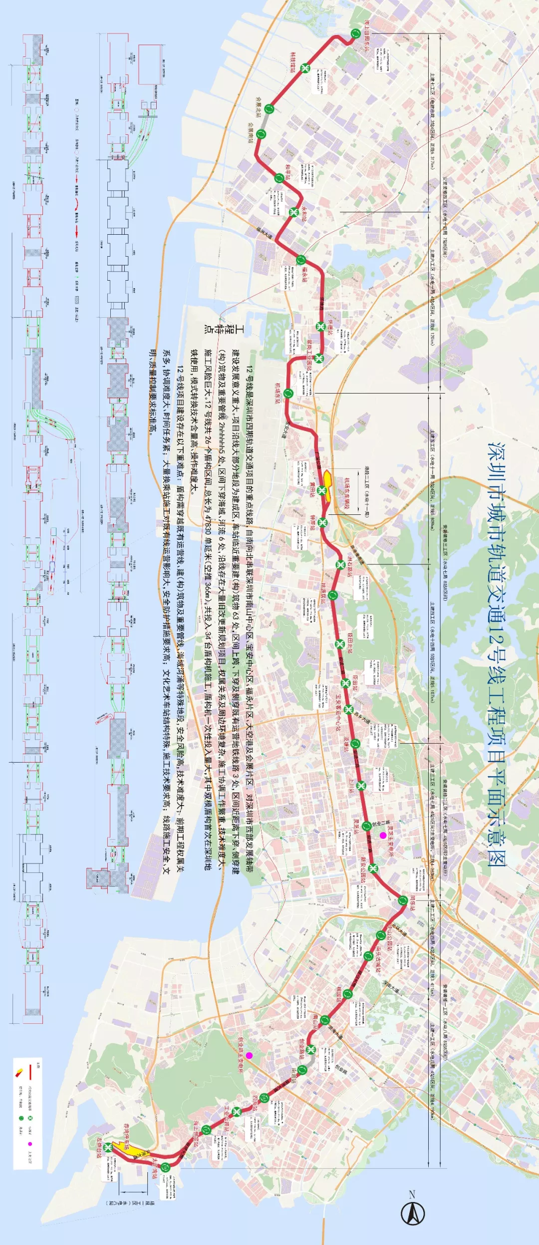 地鐵12號線起自南山區(qū)左炮臺站自南向北穿越南山中心區(qū)、寶安中心區(qū)、福永、大空港等片區(qū)后終至寶安區(qū)海上田園東站,線路全長40.56km,是進(jìn)一步支撐深圳西部發(fā)展,提升前海蛇口自貿(mào)區(qū),空港新城發(fā)展品質(zhì)的交通骨干線。