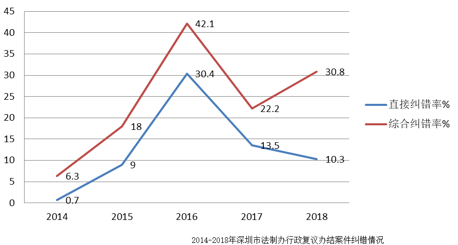 2018年深圳行政復(fù)議案件數(shù)量大幅減少,這可能與“兩隨機(jī)一公開(kāi)”執(zhí)法全面推廣后執(zhí)法規(guī)范性進(jìn)一步提高和執(zhí)法爭(zhēng)議減少有關(guān)。辦結(jié)的行政復(fù)議案件中,被撤銷(xiāo)或確認(rèn)違法的案件比例繼續(xù)降低,但裁定終止的案件總件數(shù)雖略少于上年,比例卻有一定幅度上升??傮w而言,行政復(fù)議的直接糾錯(cuò)率有所下降,但間接糾錯(cuò)率有所上升,較好發(fā)揮了行政復(fù)議對(duì)行政執(zhí)法的監(jiān)督作用。
