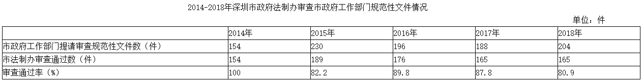 2018年2月發(fā)布了修訂后《深圳市行政機(jī)關(guān)規(guī)范性文件管理規(guī)定》(深圳市人民政府令第305號(hào)令),明確規(guī)定政府規(guī)范性文件在提請(qǐng)市政府常務(wù)會(huì)議審議前,必須先經(jīng)政府法制機(jī)構(gòu)合法性審查,并梳理形成規(guī)范性文件“統(tǒng)一要求、統(tǒng)一審查、統(tǒng)一征求意見(jiàn)、統(tǒng)一有效期、統(tǒng)一登記、統(tǒng)一編號(hào)、統(tǒng)一發(fā)布、統(tǒng)一查詢(xún)平臺(tái)”的“八統(tǒng)一”管理模式,在規(guī)范性文件制定主體、范圍、權(quán)限、程序等方面,提出了比國(guó)家要求更為嚴(yán)格、具體的要求。截至2018年底,市法制辦共收到市政府工作部門(mén)提請(qǐng)審查的規(guī)范性文件204項(xiàng),審查通過(guò)165項(xiàng),通過(guò)率為80.9%。