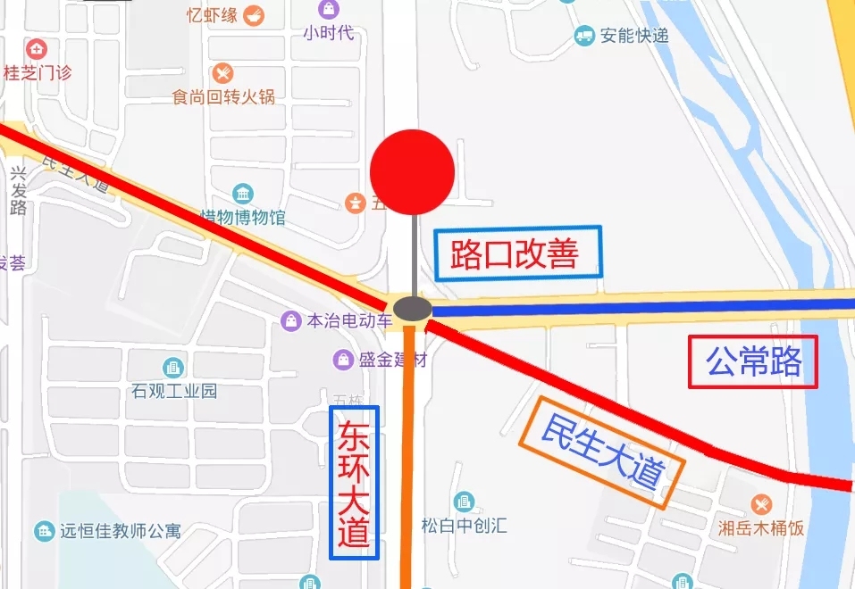 ▼改造前:東環(huán)大道、公常路皆為光明區(qū)主干道,車流量大,但車道狹窄,路口擁堵,存在極大的安全隱患。此外,該路口人車混行,非機(jī)動車逆行現(xiàn)象嚴(yán)重,中間岔口僅用石墩圍擋,安全隱患突出。