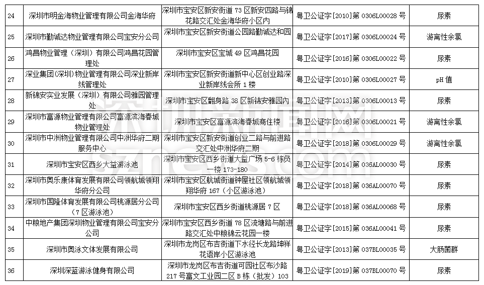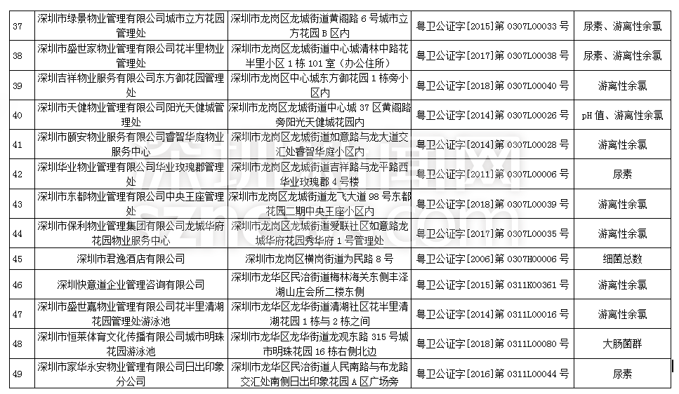 此次檢查結(jié)果顯示,深圳明門偉健體育服務(wù)有限公司(游泳池)、深圳市綠景物業(yè)管理有限公司城市立方花園管理處(游泳池)、深圳市盛世家物業(yè)管理有限公司花半里物業(yè)管理處(游泳池)尿素、游離性余氯兩項檢測指標(biāo)不合格,深圳市力美健華聯(lián)健身有限公司(游泳池)pH值、尿素兩項檢測指標(biāo)不合格,錦龍體育文化發(fā)展(深圳)有限公司(游泳池)、深圳市安居樂業(yè)物業(yè)管理有限公司(游泳池)、深圳市天健物業(yè)管理有限公司陽光天健城管理處(游泳池)pH值、游離性余氯兩項檢測指標(biāo)不合格,此外,有45家游泳場所分別因pH值、尿素、游離性余氯、細(xì)菌總數(shù)以及大腸菌群等指標(biāo)不合格被予以通告。衛(wèi)生監(jiān)督部門已責(zé)令抽檢結(jié)果不合格單位立即整改。
