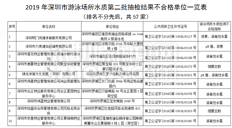 見圳客戶端·深圳新聞網(wǎng)2019年8月29日訊(見圳客戶端、深圳新聞網(wǎng)記者 劉夢婷 通訊員 深衛(wèi)監(jiān))深圳市衛(wèi)生健康委近期組織了各級衛(wèi)生監(jiān)督機構(gòu)對全市游泳場所水質(zhì)進(jìn)行了分批專項抽樣檢驗,并在近日公布了2019年第二批游泳場所水質(zhì)抽檢結(jié)果。第二批共抽檢游泳場所451家,檢測指標(biāo)為游離性余氯、渾濁度、尿素、pH值、細(xì)菌總數(shù)、大腸菌群等六項。抽檢的451家游泳場所中,合格399家,合格率為88.47%,不合格52家,不合格率為11.53%;不合格指標(biāo)主要為游離性余氯、尿素、細(xì)菌總數(shù)、pH值和大腸菌群。