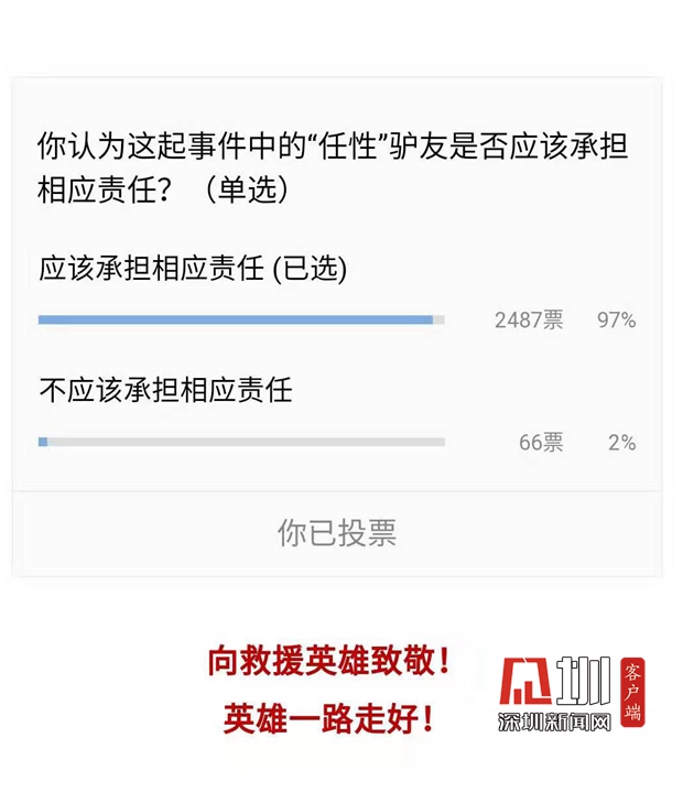 有一個(gè)細(xì)節(jié)是,這批受困的驢友上山溯溪的時(shí)間正是深圳發(fā)布臺(tái)風(fēng)預(yù)警信號(hào)的時(shí)間,因此很多人也認(rèn)為在臺(tái)風(fēng)天探險(xiǎn),驢友過于任性。在深圳新聞網(wǎng)微信公眾號(hào)發(fā)起的小調(diào)查(你認(rèn)為這起事件中的“任性”驢友是否應(yīng)該承擔(dān)相應(yīng)責(zé)任?(單選))中,共有2553名網(wǎng)友作答,97%的人認(rèn)為應(yīng)該承擔(dān)相應(yīng)責(zé)任。