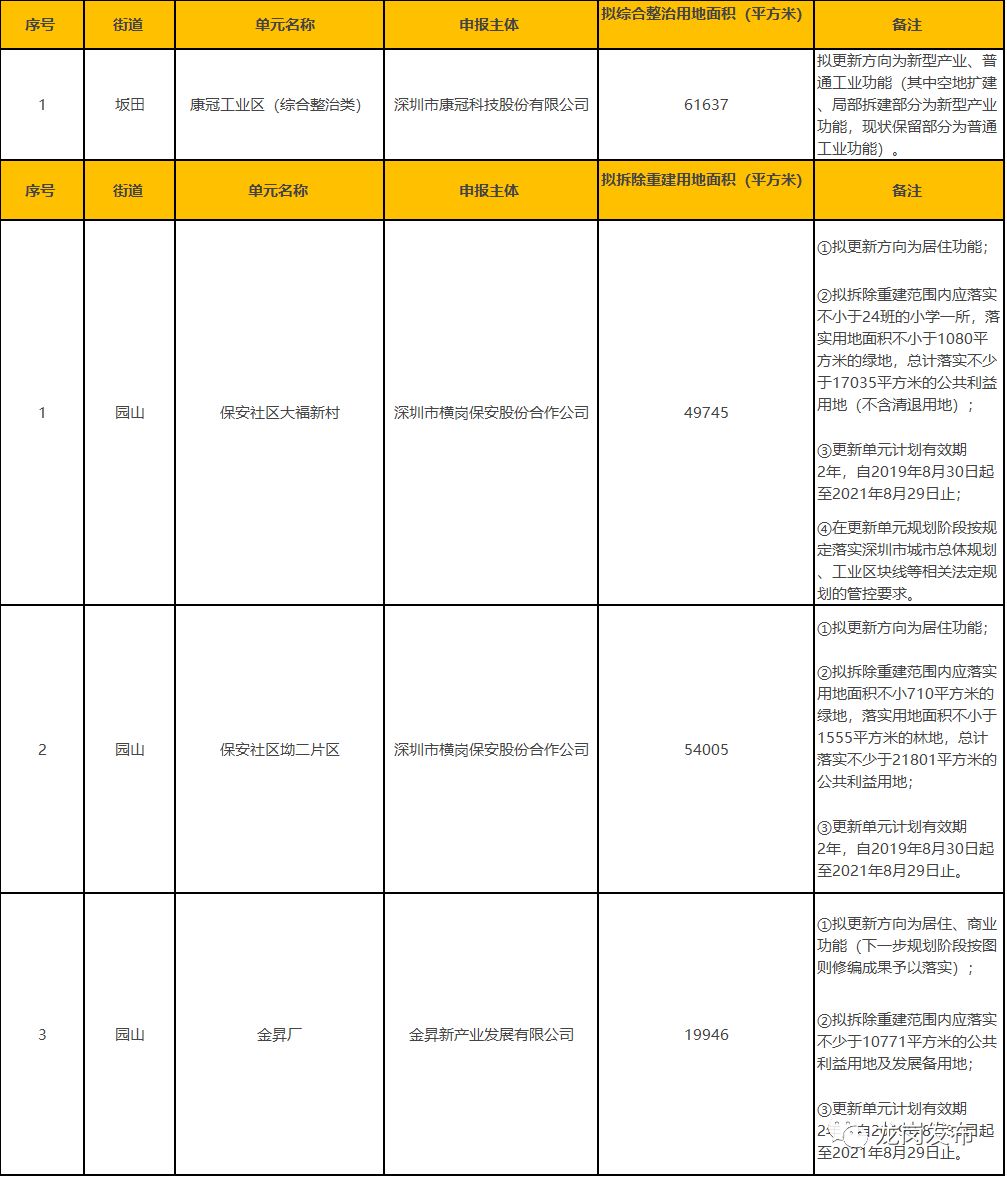 1、本表所列的城市更新單元須按照城市更新相關(guān)政策完成城市更新單元規(guī)劃編制及項(xiàng)目實(shí)施主體確認(rèn)等工作后方可實(shí)施開發(fā)建設(shè)。