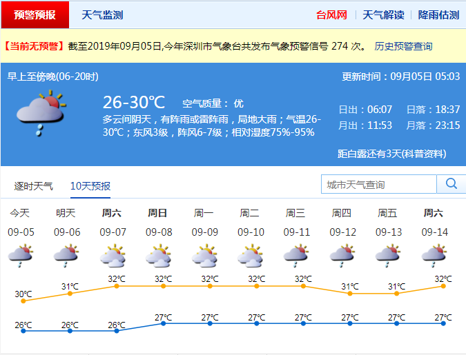 見圳客戶端、深圳新聞網2019年9月5日訊 今年14號臺風“劍魚”(熱帶風暴級)3日17時減弱為熱帶低壓后,其風力進一步減弱,已難以確定其環(huán)流中心,中央氣象臺于4日2時停止對其編號。市氣象臺于4日8時30分取消臺風白色預警信號。盡管如此,受“劍魚”減弱后低壓槽影響,今日我市有大雨局部暴雨,沿海、海區(qū)和高地陣風6-7級;6日降雨減弱;7日起轉多云,有短時陣雨,天氣炎熱。