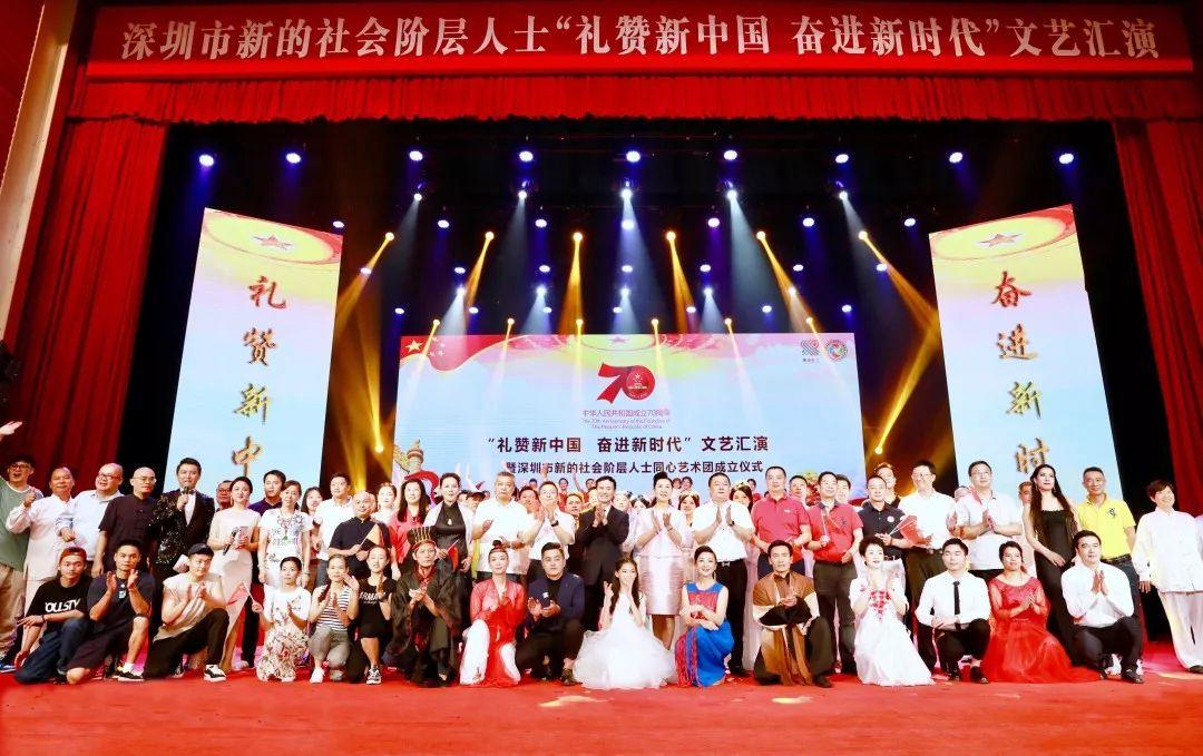 演出前,深圳市新的社會階層人士同心藝術(shù)團揭牌。本次文藝匯演是在市委統(tǒng)戰(zhàn)部指導下,以及各區(qū)統(tǒng)戰(zhàn)部門支持下,由市新聯(lián)會牽頭,聯(lián)合各區(qū)新聯(lián)會共同舉辦的獻禮新中國成立70周年慶祝活動之一?,F(xiàn)場氣氛喜慶溫馨,通過網(wǎng)絡(luò)直播的方式和場外新的社會階層人士和十多萬名觀眾互動。