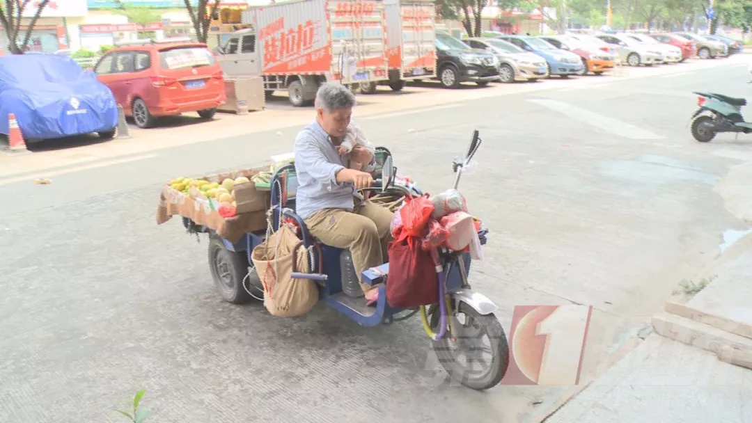 一家人的生計來源,除了孩子爸爸打工每月的3000多工資,就靠孩子奶奶開著這個小三輪車,每天見縫插針出去換著地方賣水果。