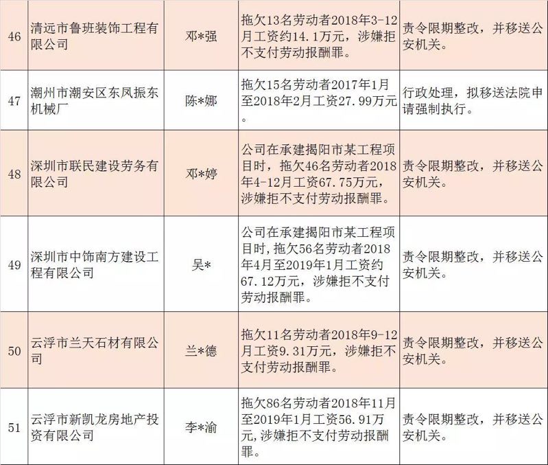 今年第二季度以來,廣東省人力資源社會保障行政部門繼續(xù)加大對欠薪等重大違法行為的打擊力度,各地特別是廣州、深圳、珠海、惠州、中山等地對欠薪逃匿、欠薪屢教不改、欠薪涉及人數(shù)和金額巨大等違法行為重拳出擊,依法處罰處理,對涉嫌犯罪的堅決移送司法機關(guān)繩之以法,切實維護勞動者的勞動報酬等權(quán)益。為加強對違法用人單位的社會監(jiān)督,強化誠信體系建設(shè),加大威懾力,日前省人社廳披露了2019年第三批重大違法案件,這51家黑心企業(yè)中就有10家是深圳“揪”出來的(如圖)。