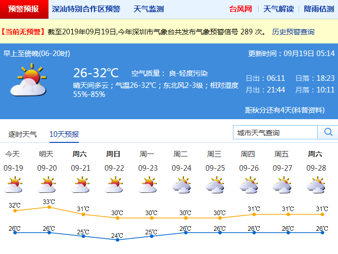 見(jiàn)圳客戶端·深圳新聞網(wǎng)2019年9月19日訊 記者從深圳市氣象局獲悉19日晴天間多云,氣溫26-33℃;20-23日持續(xù)晴熱干燥。其中菲律賓以東洋面的熱帶擾動(dòng)云團(tuán)正在發(fā)展,預(yù)計(jì)其總體趨勢(shì)北上,對(duì)我市以及華南沿海無(wú)明顯風(fēng)雨影響,但20日前后將受其外圍偏北下沉氣流影響。