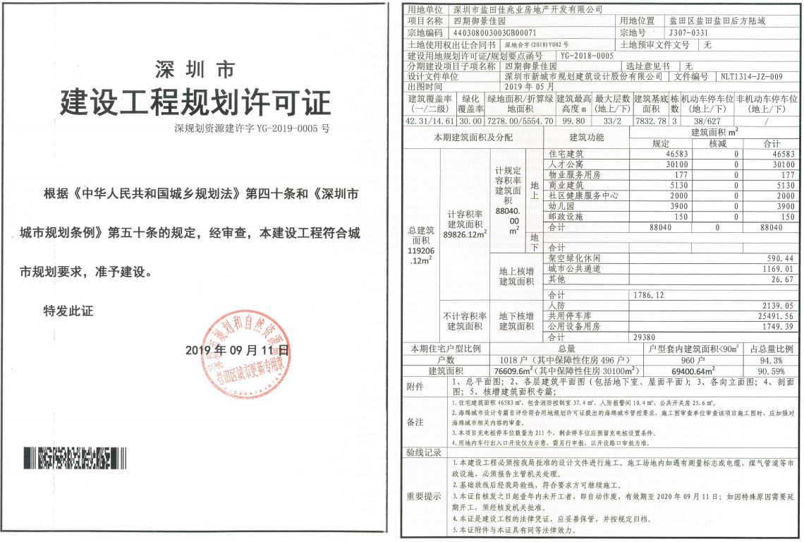 公告顯示,深圳市鹽田佳兆業(yè)房地產(chǎn)開(kāi)發(fā)有限公司的四期御景佳園項(xiàng)目(鹽田三、四村和西山嚇村整體搬遷項(xiàng)目5號(hào)地塊),位于鹽田區(qū)鹽田港后方陸域J307-0331號(hào)宗地,用地面積18514.16平方米,允許建設(shè)總建筑面積88040平方米,其中住宅46583平方米、人才公寓30100平方米。本期住宅1018戶,其中保障性住房496戶。
