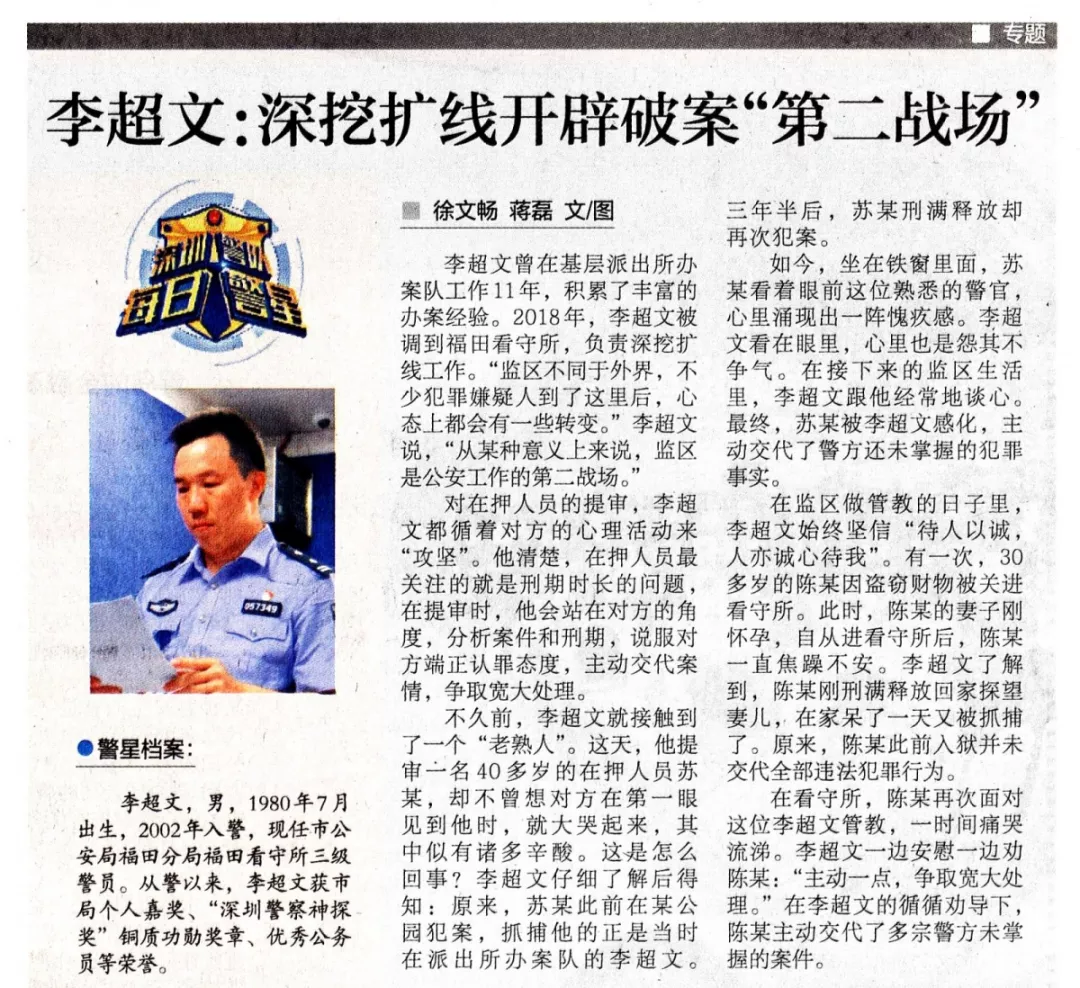 李超文曾在基層派出所辦案隊工作11年,積累了豐富的辦案經(jīng)驗。2018年,李超文被調(diào)到福田看守所,負(fù)責(zé)深挖擴(kuò)線工作?!氨O(jiān)區(qū)不同于外界,不少犯罪嫌疑人到了這里后,心態(tài)上都會有一些轉(zhuǎn)變?!崩畛恼f,“從某種意義上來說,監(jiān)區(qū)是公安工作的第二戰(zhàn)場?!?/p>