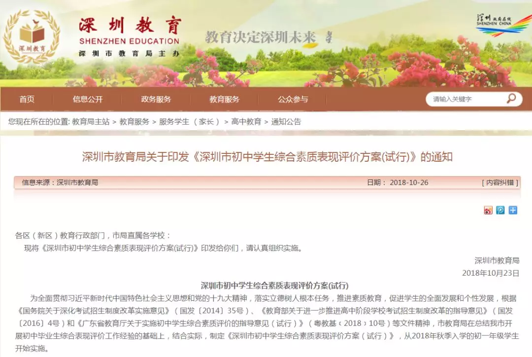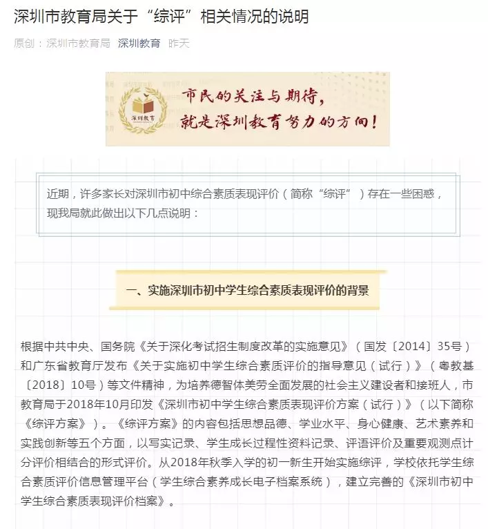 《深圳市初中學生綜合素質表現(xiàn)評價方案(試行)》(以下簡稱《綜評方案》)于2018年10月印發(fā)。