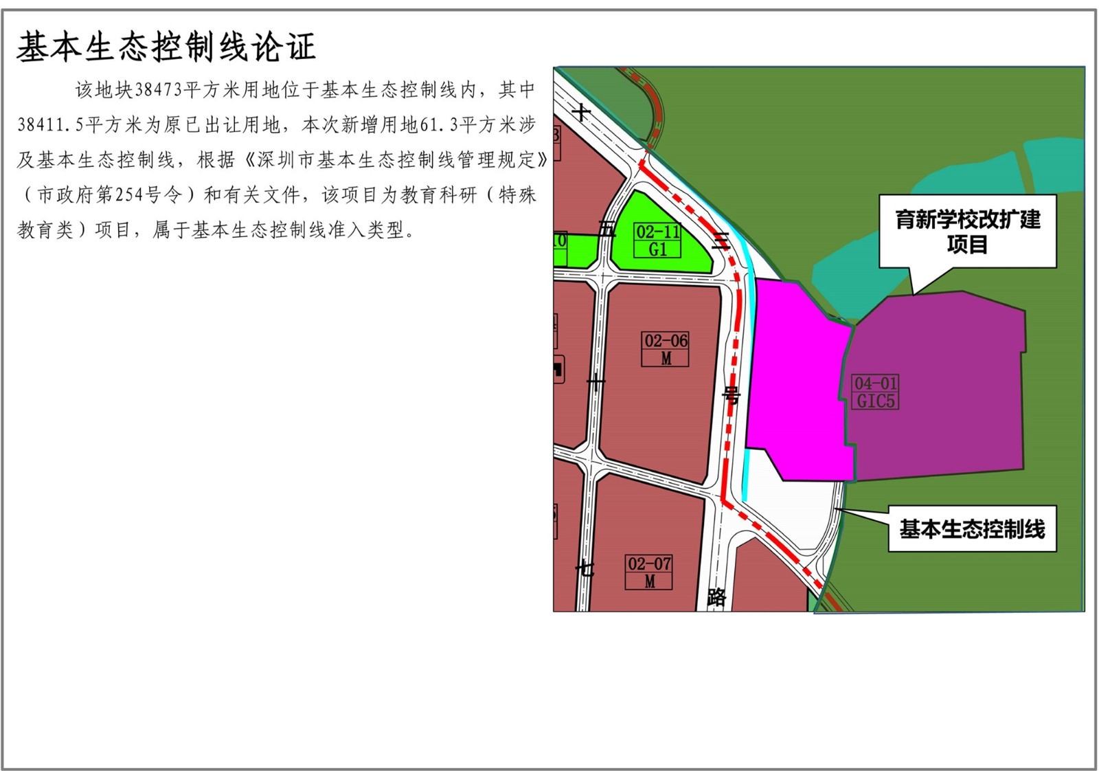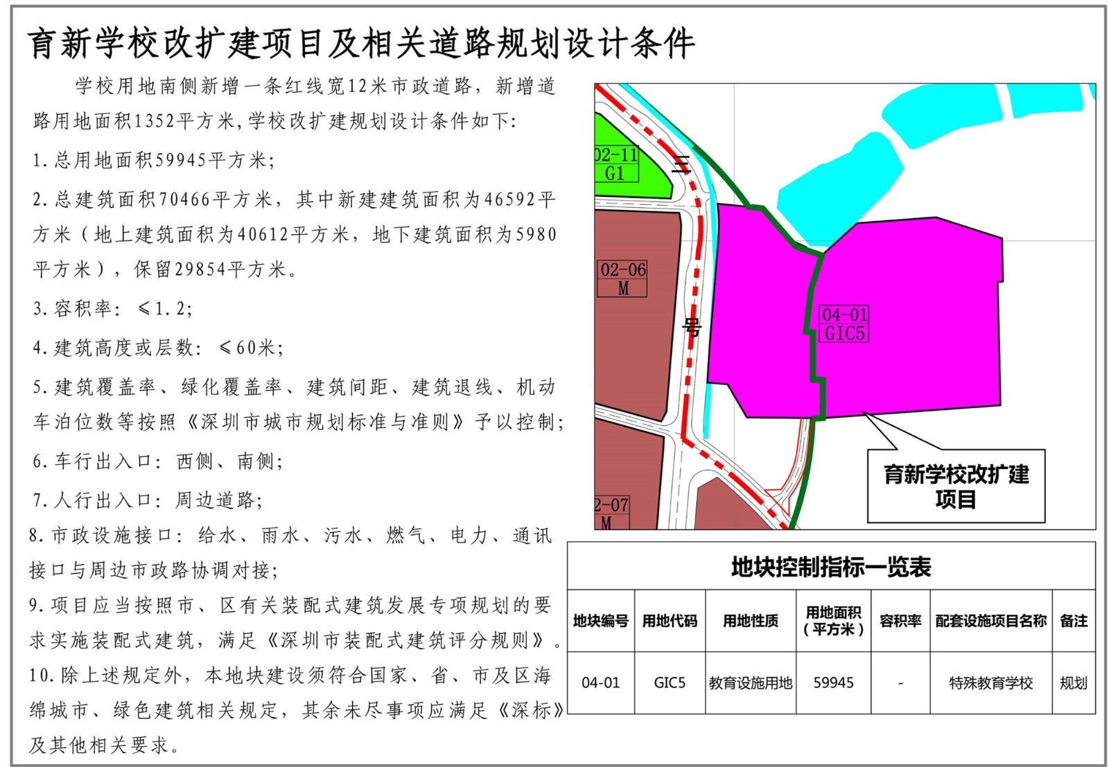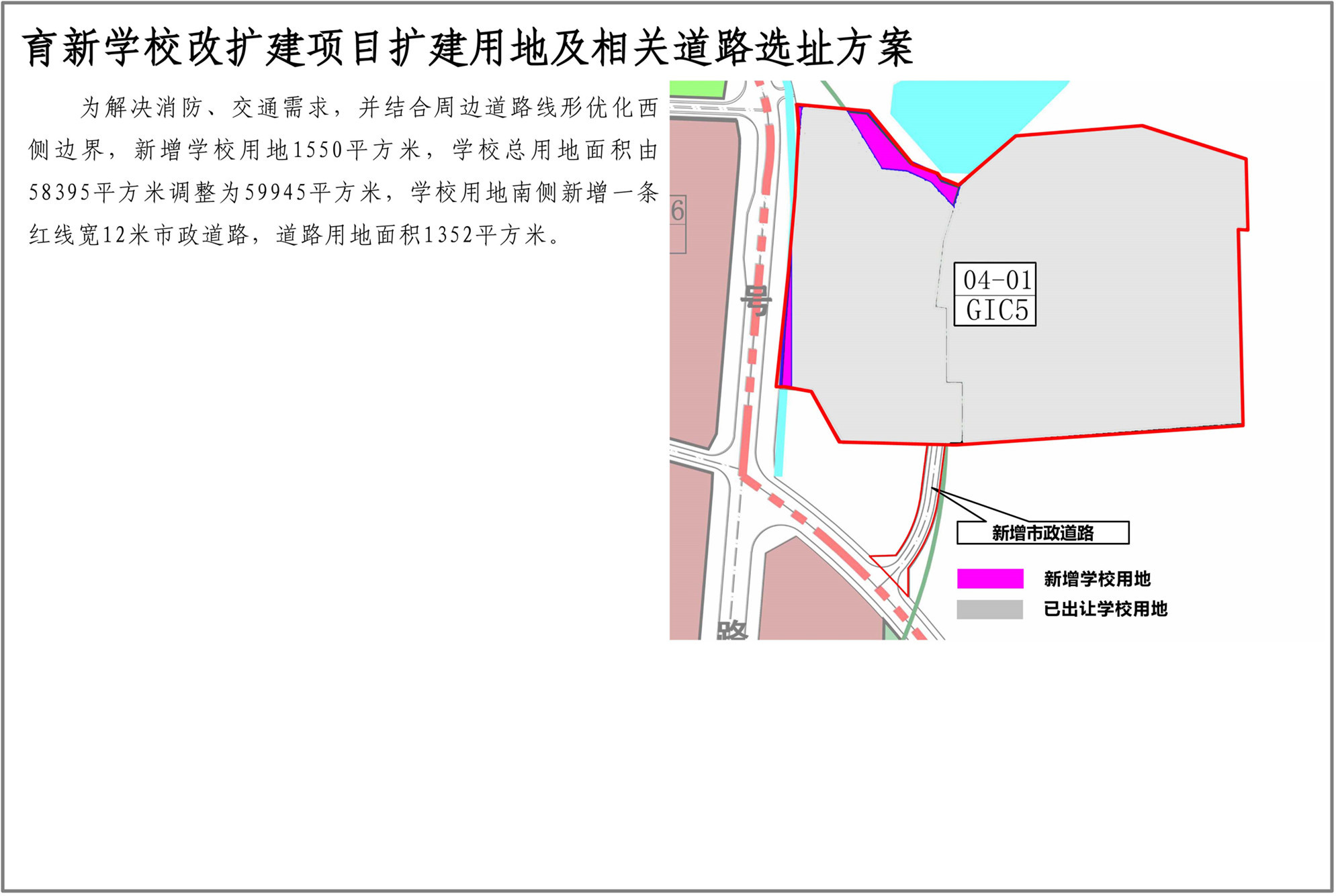 深圳市育新學校位于光明街道碧眼社區(qū),規(guī)劃觀光路(現(xiàn)狀已建)和二十三號路(現(xiàn)狀已建)交叉口西北側(cè)。為消除校園消防、交通出行安全隱患,滿足規(guī)范需求,新增學校用地1550平方米,以解決消防、交通需求,并結(jié)合周邊道路線形優(yōu)化西側(cè)邊界,學??傆玫孛娣e由58395平方米調(diào)整為59945平方米,學校用地南側(cè)新增一條紅線寬12米市政道路,道路用地面積1352平方米。
