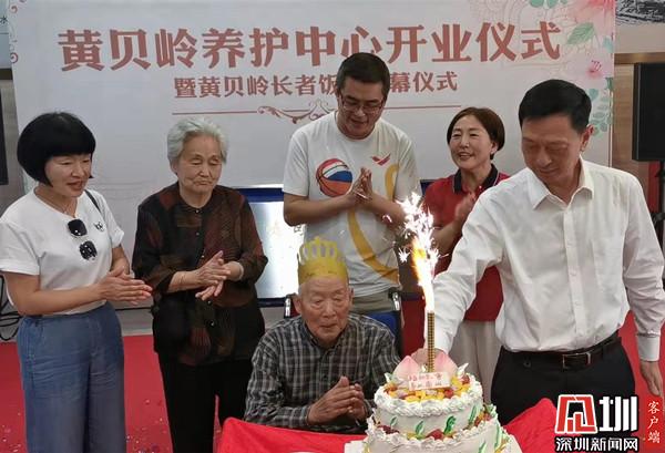 當(dāng)天下午,在歡樂喜慶的背景音樂中,羅湖區(qū)政協(xié)主席吳裕中、副主席羅安娜,羅湖區(qū)衛(wèi)生健康局局長鄭理光,羅湖區(qū)民政局局長楊文秀,羅湖醫(yī)院集團(tuán)院長孫喜琢,黃貝嶺靖軒股份公司董事長張偉明一起為黃貝嶺養(yǎng)護(hù)中心及黃貝嶺長者飯?zhí)媒遗啤V?,有?3年黨齡的86歲老人惠發(fā)安坐著輪椅,和62年黨齡的83歲老伴張歧蘭一起,伴著推來的生日蛋糕來到揭牌現(xiàn)場,當(dāng)天正是惠發(fā)安86歲大壽生日,參加開業(yè)儀式的羅湖區(qū)政協(xié)委員、羅湖區(qū)衛(wèi)健局負(fù)責(zé)人等和現(xiàn)場人員一起,一邊鼓掌一邊唱起生日歌,為老人溫馨慶生。