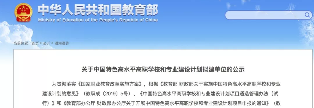 2019年4月1日,教育部、財政部聯(lián)合印發(fā)《關(guān)于實施中國特色高水平高職學(xué)校和專業(yè)建設(shè)計劃的意見》,提出要集中力量建設(shè)50所左右高水平高職學(xué)校和150個左右高水平專業(yè)群,打造技術(shù)技能人才培養(yǎng)高地和技術(shù)技能創(chuàng)新服務(wù)平臺。