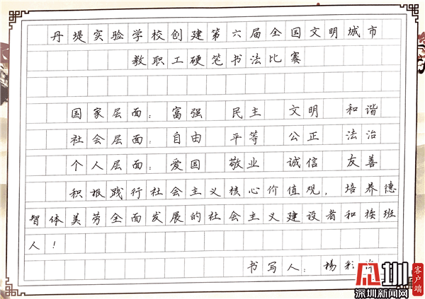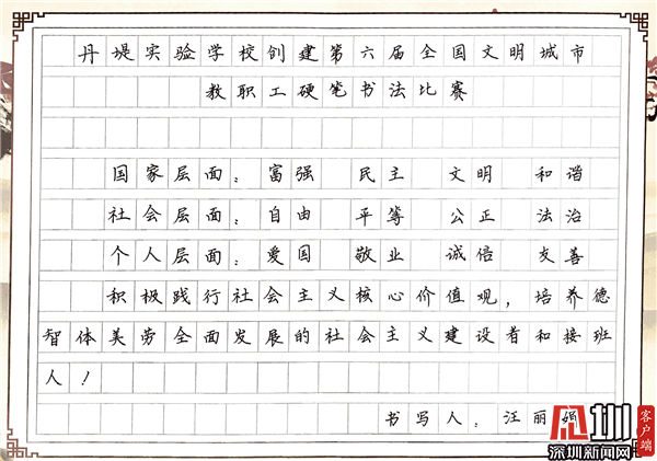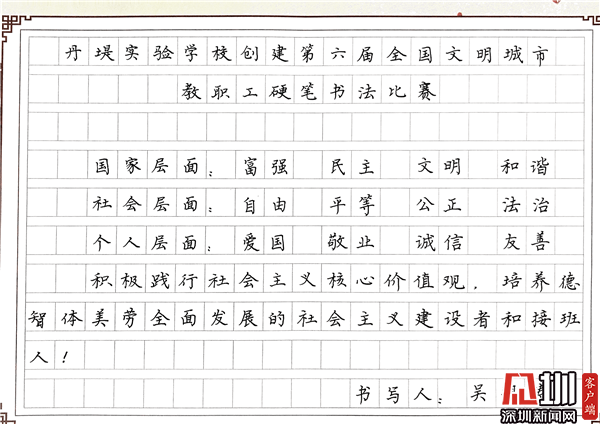 見圳客戶端·深圳新聞網(wǎng)10月29日訊(見圳客戶端、深圳新聞網(wǎng)記者 潘寶儀 通訊員 袁小俊 圖/朱雅琪 ) 為落實立德樹人總目標(biāo)、培育和踐行社會主義核心價值觀,創(chuàng)建文明城市,積極倡導(dǎo)全校教職工勤練教學(xué)基本功,提高教師綜合素養(yǎng),豐富課余生活,展示丹堤實驗學(xué)校教職工風(fēng)采,學(xué)校于10月25日舉行了“創(chuàng)建第六屆全國文明城市教職工硬筆書法比賽”。