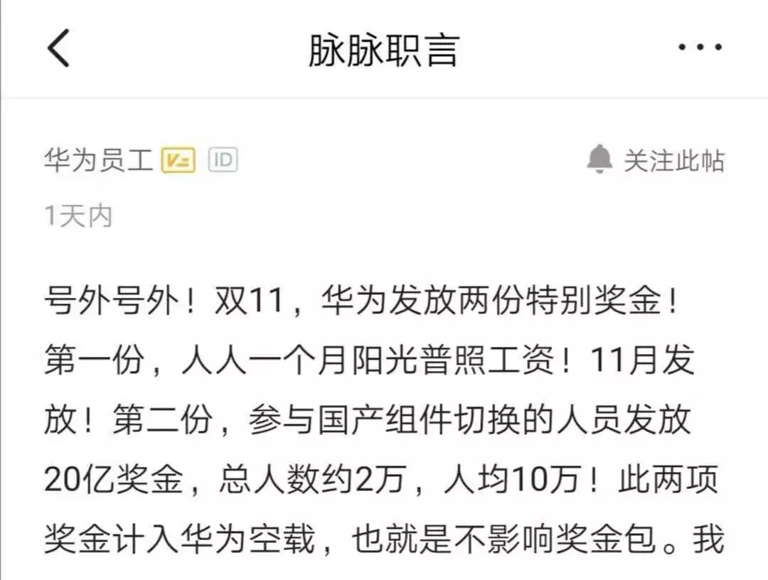 還有網(wǎng)友表示,“20億是只獎(jiǎng)勵(lì)大概兩萬人,針對(duì)的是把美國零部件替換成華為自己零部件的研發(fā)崗位人員,其他所有華為正式員工,包括上面的兩萬多人,獎(jiǎng)勵(lì)一個(gè)月工資,工資參考的10月份的工資,年終獎(jiǎng)不受影響?!?/p>