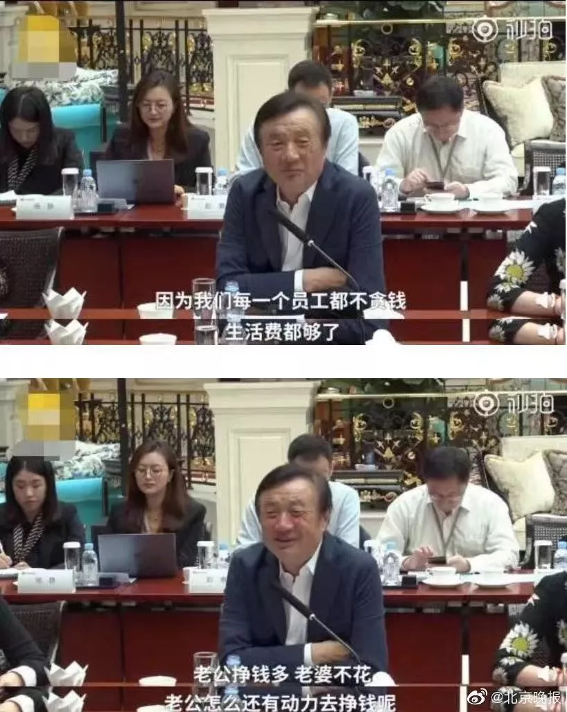 5月21日,任正非在華為總部接受采訪時,談到華為每年花200億美元在研發(fā)上,即使華為財務(wù)受到一點挫折也不會影響科研投入,因為員工都不貪錢,生活費都夠了?!澳闳柹莩奁返昀镔I幾個包的,老公是哪里的?華為的。老婆不花,老公怎么有動力去掙錢呢?”