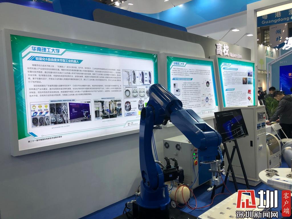 在粵港澳大灣區(qū)展示區(qū)中還有廣東省高校參展。華南理工大學(xué)的輕量化6自由度關(guān)節(jié)型工業(yè)機(jī)器人正在進(jìn)行現(xiàn)場展示。