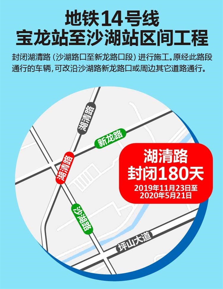 2019年11月23日至2020年5月21日共180天,封閉湖清路(沙湖路口至新龍路口段)進行施工。原經(jīng)此路段通行的車輛,可改沿沙湖路新龍路口或周邊其它道路通行。