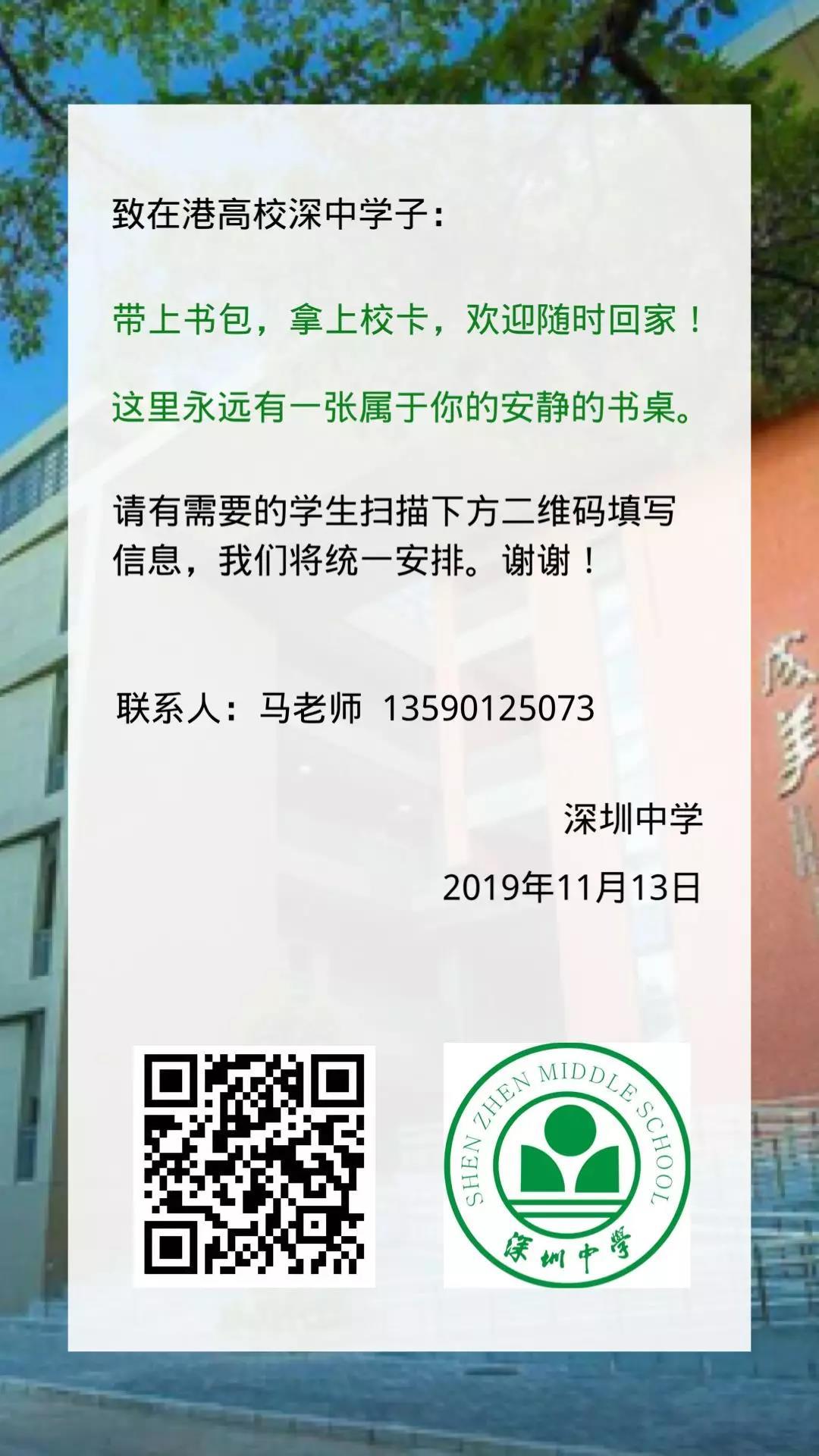 見(jiàn)圳客戶(hù)端·深圳新聞網(wǎng)2019年11月14日訊 繼香港中文大學(xué)(深圳)發(fā)文表示為內(nèi)地在港就讀學(xué)生提供臨時(shí)免費(fèi)住宿后,深圳中學(xué)今天也在官方微信公號(hào)中致信在港高校深中學(xué)子,只要拿上校園卡,深中隨時(shí)歡迎學(xué)子們回家!學(xué)校將對(duì)有需要的學(xué)生統(tǒng)一進(jìn)行安排。