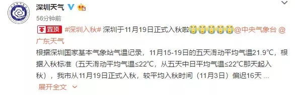 根據(jù)深圳國家基本氣象站氣溫記錄,11月15-19日的五天滑動平均氣溫21.9℃,根據(jù)入秋標準(五天滑動平均氣溫≤22℃,從五天中日平均氣溫≤22℃那天起入秋),我市從11月19日正式入秋,較平均入秋時間(11月3日)偏遲16天。