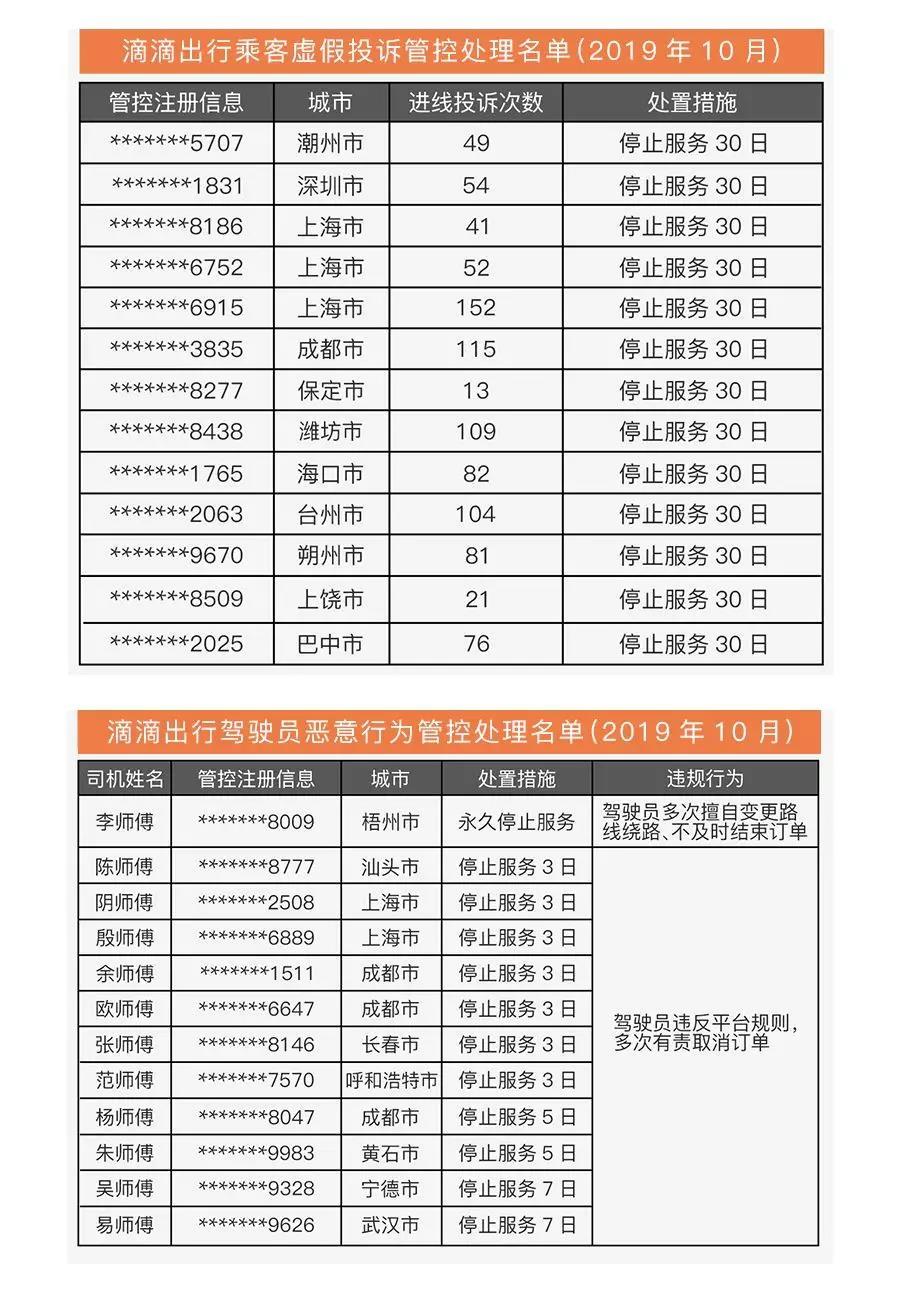 晶報(bào)2019年11月20日訊 11月20日,滴滴出行通過官方微信公眾號(hào)對(duì)10月違規(guī)司、乘“黑名單”進(jìn)行了公示。乘客黑名單中,惡意投訴次數(shù)最多的高達(dá)152次;司機(jī)黑名單中一位梧州市的李師傅因多次擅自變更路線繞路、不及時(shí)結(jié)束訂單等違規(guī)行為被永久停止服務(wù)。