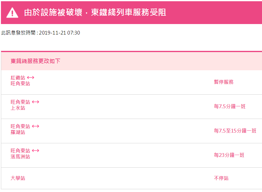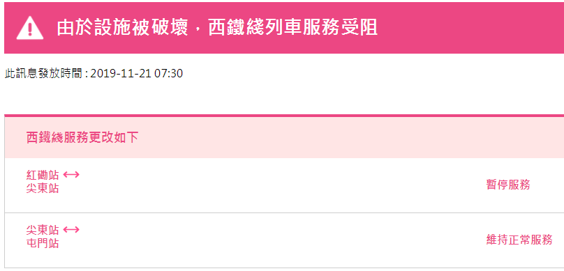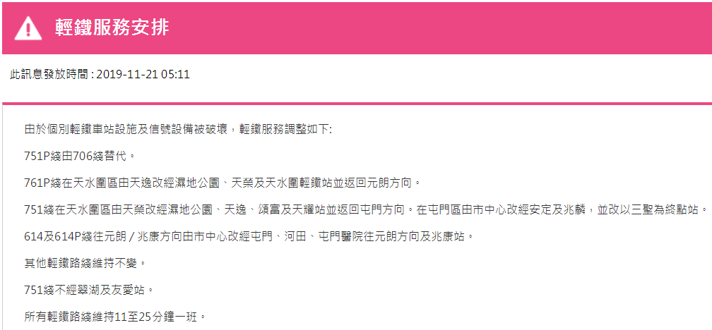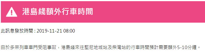 據(jù)港鐵消息,11月21日,香港地鐵各線(機(jī)場快線除外)、輕鐵及港鐵巴士的服務(wù)將于晚上11時結(jié)束。西鐵線/東鐵線紅磡站及大學(xué)站繼續(xù)關(guān)閉。需要注意的是,元朗站將于下午2時關(guān)閉,列車不停元朗站,此外,個別車站出入口會暫時關(guān)閉。