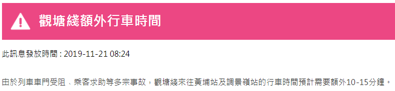 此外,目前,由于列車車門受阻,乘客求助等多宗事故,港島線來往堅(jiān)尼地城站及柴灣站、荃灣線來往中環(huán)站及荃灣站、觀塘線來往黃埔站及調(diào)景嶺站,行車時間預(yù)計需要額外10至15分鐘。