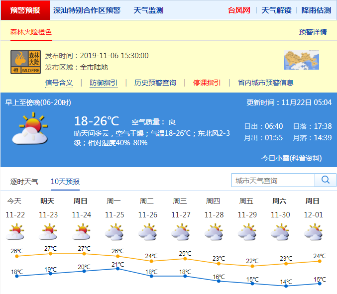 見圳客戶端·深圳新聞網(wǎng)2019年11月22日訊 深圳市氣象局預(yù)計(jì)22日晴天干燥,早晚清涼,氣溫18-26℃;23-24日多云間晴天,部分時間有輕霧或霾;25日夜間至26日冷空氣影響,北風(fēng)加大,氣溫略降;展望27日夜間冷空氣繼續(xù)補(bǔ)充,氣溫持續(xù)下降。