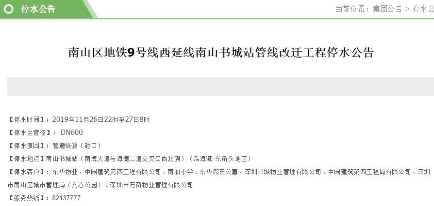 停水客戶:東華物業(yè)、中國建筑第四工程有限公司、南油小學、東華假日公寓、深圳書城物業(yè)管理有限公司、中國建筑第四工程局有限公司、深圳市南山區(qū)城市管理局(文心公園)、深圳市萬商物業(yè)管理有限公司