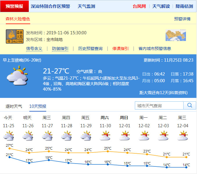 據(jù)悉,26日受冷空氣影響,氣溫下降,早晨最低氣溫降至16-17℃,沿海、高地和海區(qū)最大陣風(fēng)6級(jí)左右;27日風(fēng)力減弱,早晚清涼;28-30日冷空氣持續(xù)補(bǔ)充影響,空氣持續(xù)干燥,氣溫逐日下降。深圳市氣象臺(tái)2019-11-2508:23:00發(fā)布。