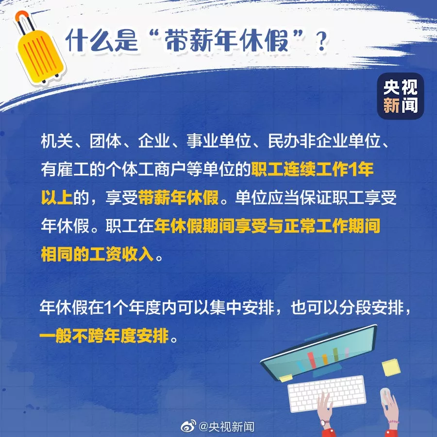 據(jù)《職工帶薪年休假條例》:職工累計工作時間已滿1年不滿10年,年休假5天;已滿10年不滿20年,年休假10天;已滿20年,年休假15天。